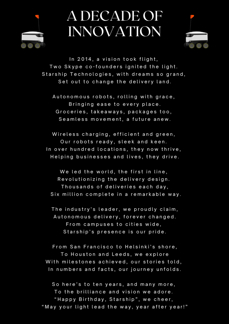 Starship Technologies and our selected partners use cookies and similar technologies (together “cookies”) that are necessary to present this website, and to ensure you get the best experience of it. If you consent to it, we will also use cookies for analytics and marketing purposes.